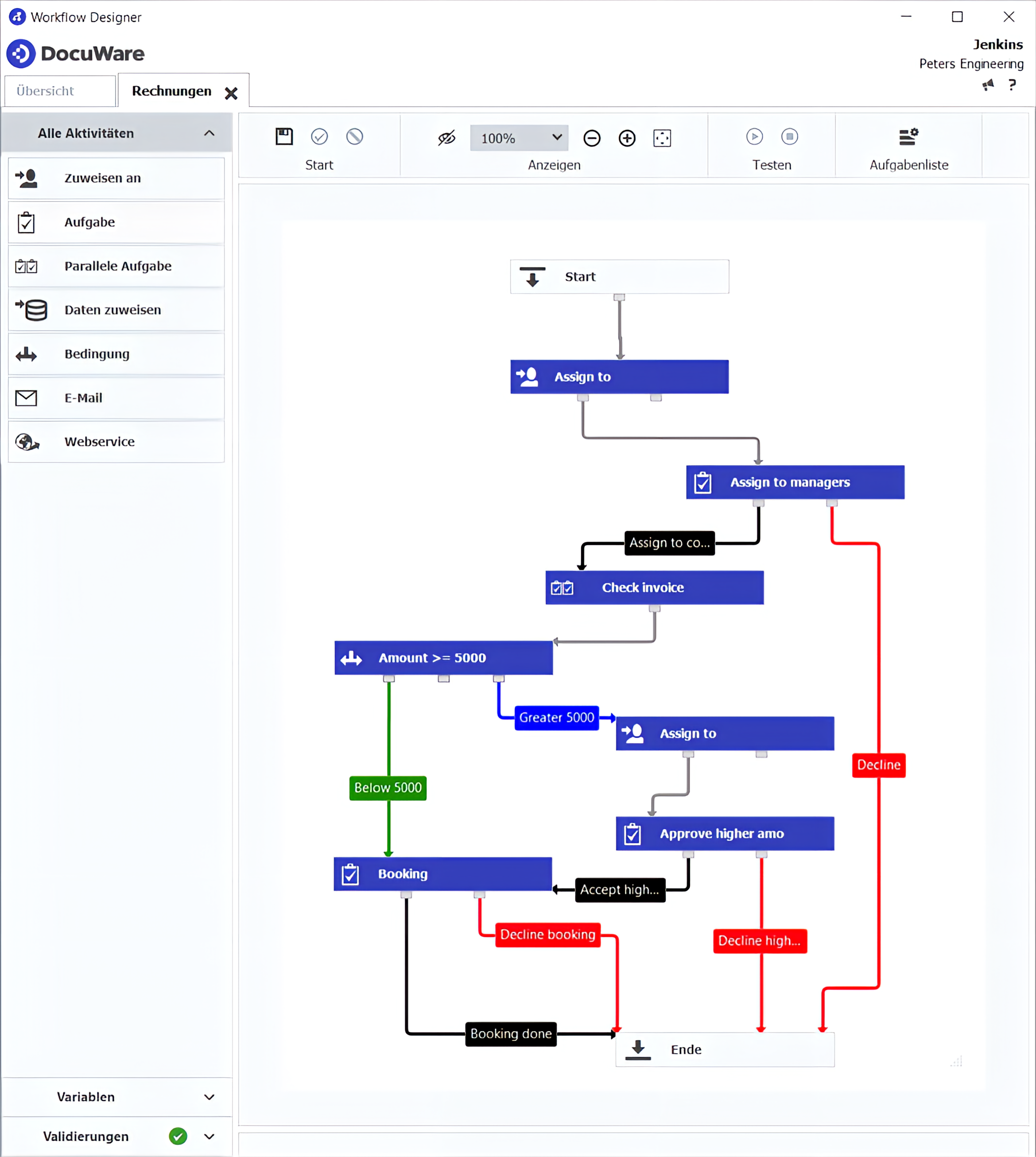 Viele Unternehmensbereiche benötigen einen reibungslosen, automatisierten Informationsaustausch, um sicherzustellen, dass alle im Team zur richtigen Zeit die nötigen Informationen haben, um fundierte Entscheidungen zu treffen. Der DocuWare Workflow Manager ermöglicht die effiziente Gestaltung und Automatisierung von Geschäftsprozessen. Ohne Programmierung können Sie komplexe Workflows erstellen, und jeder Mitarbeiter sieht seine Aufgaben in speziellen Listen, was den Informationsfluss und die Effizienz Ihres Unternehmens optimiert.