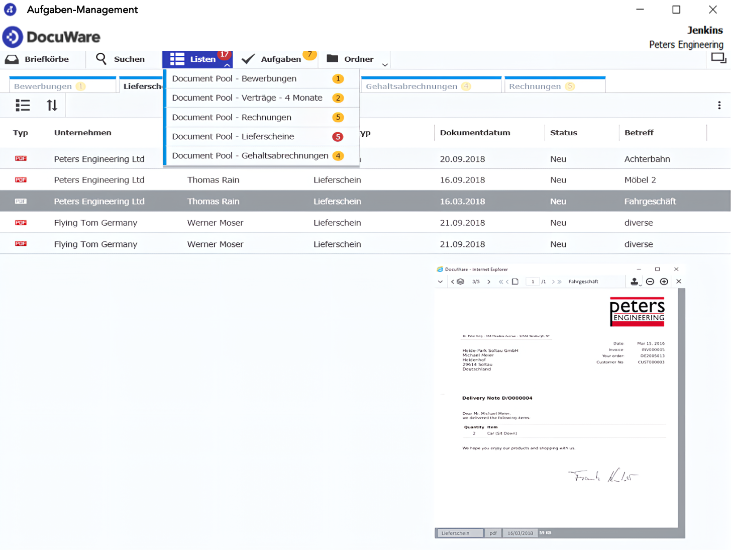 Die Definition eines Dokumentenmanagement-Systems (DMS) ist nicht eindeutig. Während manche es als einfache Datenbank für die Verwaltung von Dokumenten mit Funktionen wie Digitalisierung, Verschlagwortung und Archivierung verstehen, betrachten andere ein DMS umfassender. Zu den erweiterten Funktionen gehören Workflowmanagement, revisionssichere Langzeitarchivierung und Groupware-Funktionen. DocuWare ist ein DMS, das über die reine Dokumentenverwaltung hinausgeht und eine Vielzahl von Funktionen bietet, um Prozesse zu optimieren und die Zusammenarbeit zu verbessern. Es hilft Ihnen, Ihre Dokumente zu speichern, zu organisieren, zu suchen und zu verwalten.