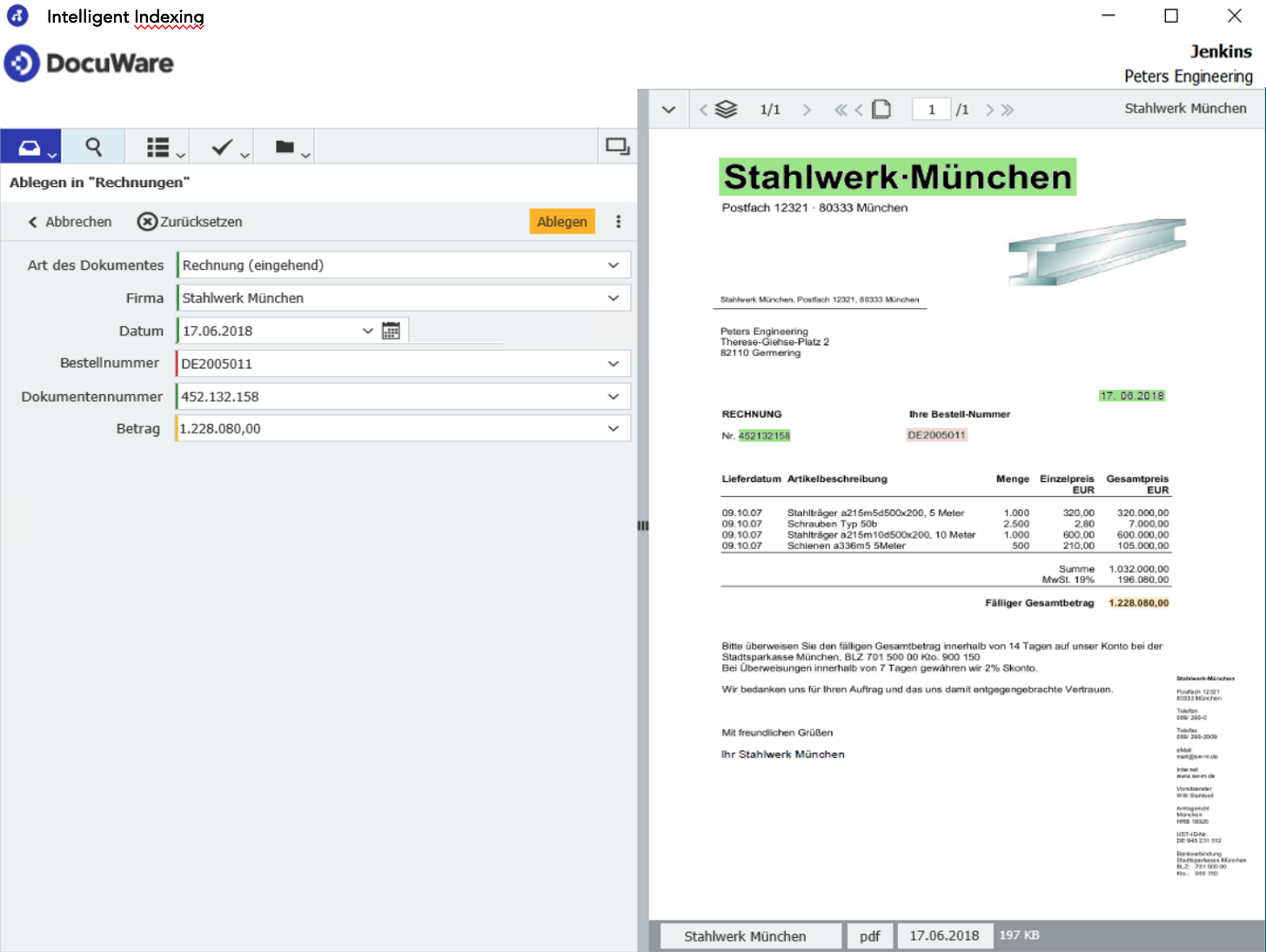 DocuWare Intelligent Indexing nutzt maschinelles Lernen zur automatischen Erfassung und zentralen Indexierung von Dokumenten. Es wird mit jeder Nutzung präziser und eliminiert manuelle Dateneingaben, was Fehler reduziert und die Effizienz steigert. Auch Papierdokumente wie Rechnungen und Verträge werden mühelos in durchsuchbare Daten umgewandelt. Intuitive Funktionen wie Zuverlässigkeitsanzeigen in Ampelfarben und schnelle Korrekturmöglichkeiten per Mausklick erleichtern die Bedienung erheblich.